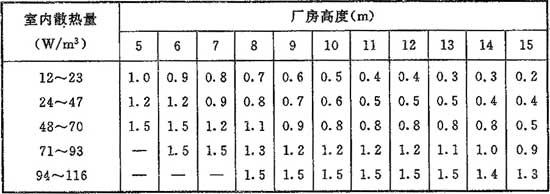 H.0.3 散熱量有效系數(shù)m值宜按相同建筑物和工藝布置的實(shí)測(cè)數(shù)據(jù)采用,當(dāng)無(wú)實(shí)測(cè)數(shù)據(jù)時(shí),單跨生產(chǎn)廠房可按下式計(jì)算:
