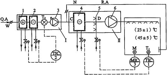 Ⅰ-新風(fēng)處理機(jī)組,Ⅱ-主空氣處理機(jī)組;1-新風(fēng)預(yù)加熱器;